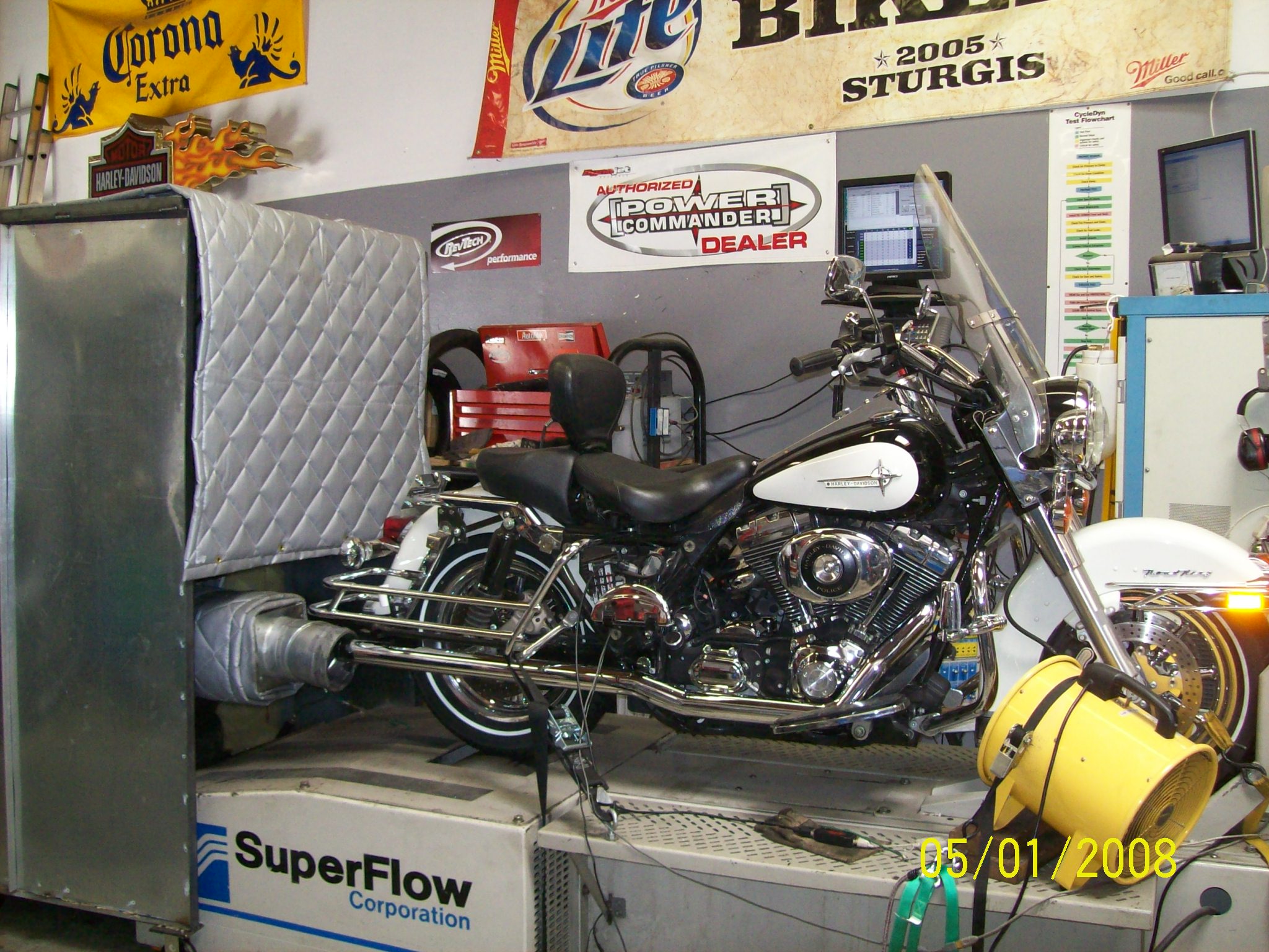 | Dynamometer Service It’s all about the air/fuel ratio. The right mixture of fuel to air is what gives us proper combustion. When all the fuel is combined with all the free oxygen in the combustion chamber there is a chemical balance. This air/fuel ratio is called the stoichiometric mixture. For gasoline this is 14.7 to 1. That is 14.7 times the mass of air to fuel. An excessively lean mixture will cause an engine to run too hot. This will cause damage to the motor and other components. An overly rich mixture is of course a waste of fuel. It becomes evident that air/fuel ratio measuring is important for tuning an engine. More and more we’re seeing fuel injected bikes with closed loop systems that can monitor and maintain desired air/fuel ratio. That’s where those oxygen sensors you see in the head pipes come into play. Carbureted and open loop fuel injected engines cannot make changes to themselves to correct for improper air/fuel mixtures. How does this air/fuel ratio change? Anything that can affect how your engine breathes will alter the ratio. Is Dyno-Tuning for you? Motorcycles from the showroom floor should be good to go. The factory bike is at specs. Most engine performance upgrades will change the air/fuel ratio requirements for your bike. Aftermarket intake, exhaust systems, and cam changes are the big concerns for re-tuning. This is where the Dynamometer comes in. While on the Dyno, your bike’s air/fuel ratio is monitored at all throttle positions and RPM ranges possible. The same combinations you would feel on the road. As mentioned before, carburetors and open loop fuel injection systems cannot correct themselves. Carbureted engines however, can be re-jetted to achieve desired results. With our load controlled Dyno we can incrementally and methodically program fuel injected tuners to also achieve the desired air/fuel mixture. A properly tuned bike will not waste fuel or ruin your engine. Currently, emission related components of vehicles under the California Air Resources Board jurisdiction can not be tampered with. The Dyno. D&D Cycle uses a CycleDyn eddy current load dynamometer built by SuperFlow Technologies Group. SuperFlow CycleDyn is also the official chassis dyno for S&S Cycle. Our machine was built in 1996. It has recently been upgraded and calibrated by SuperFlow and currently uses the latest version of WinDyn software. We are certified CycleDyn operators. |